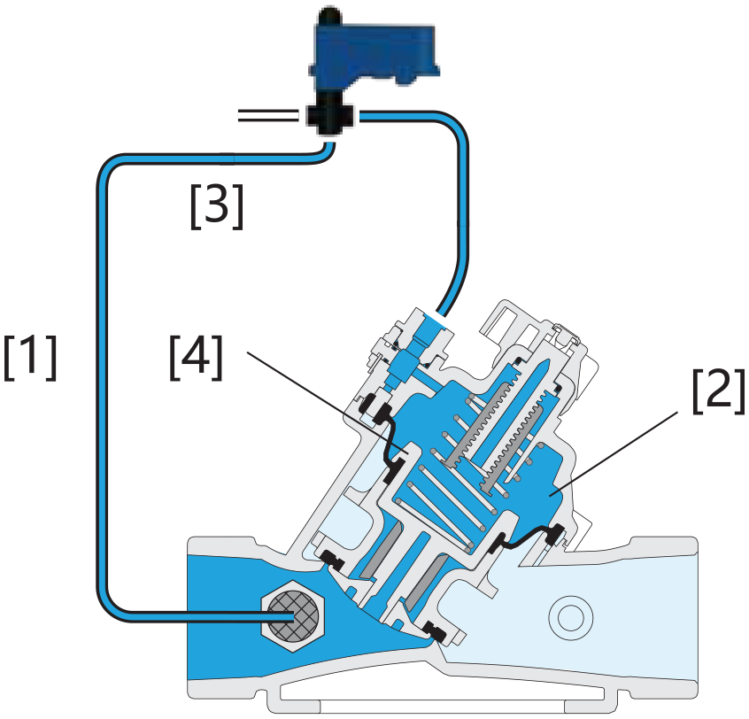 Line pressure [1] is applied to the Control Chamber [2] through the held open Solenoid Valve. This creates superior closing force that moves the Diaphragm Assembly [4] to a closed position. Upon pressure rise command, the Solenoid Valve [3] switches, releasing pressure from the control chamber and thereby opening the Main Valve. The Solenoid Valve [3] also features local manual opening and closing.